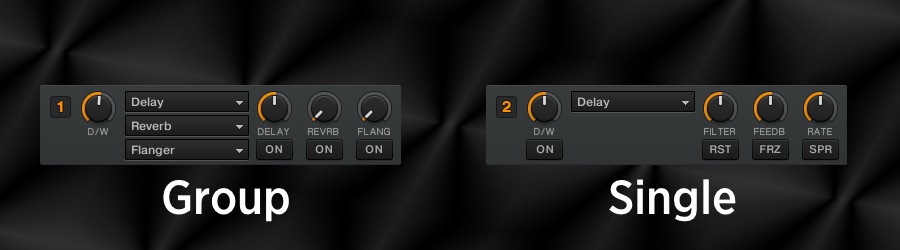 Serato DJ and Traktor Pro 2 have a very similar FX setup and workflow. In Traktor Pro 2 all effects (with the exception of Macro fx) can be toggled between “Single” or “Group”. Single mode lets DJs choose one effect with 3 adjustable knob parameters and buttons – filter, feedback, and rate in the case of the Delay effect. The parameters vary slightly from effect to effect. Group mode allows DJs to load up to 3 FX in a chain with one adjustable parameter for each effect. Each effect feeds into the next, allowing for unique combinations. The FX parameter changes depending on which effect is loaded.